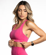 Introducing the Flow Top. The essential piece for your active and elegant style. Made with a blend of 78% Nylon and 22% Spandex, this top offers unparalleled support and comfort. Available in a palette of vibrant colors, including hot pink, black, navy, gray, and green. With a unique criss-cross detail on the back, forming an elegant "X", this top combines style and functionality. Perfect for any physical activity, from yoga to running, the Flow Top keeps you comfortable and confident at all times.